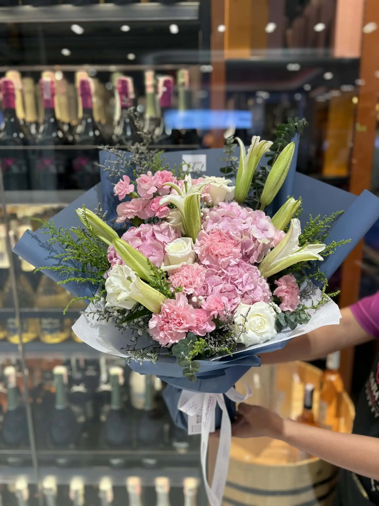 Wrapped in luxury blue paper with white accents and finished with SFP ribbon, this bouquet brings a refined, modern look while keeping a soft and feminine feel.