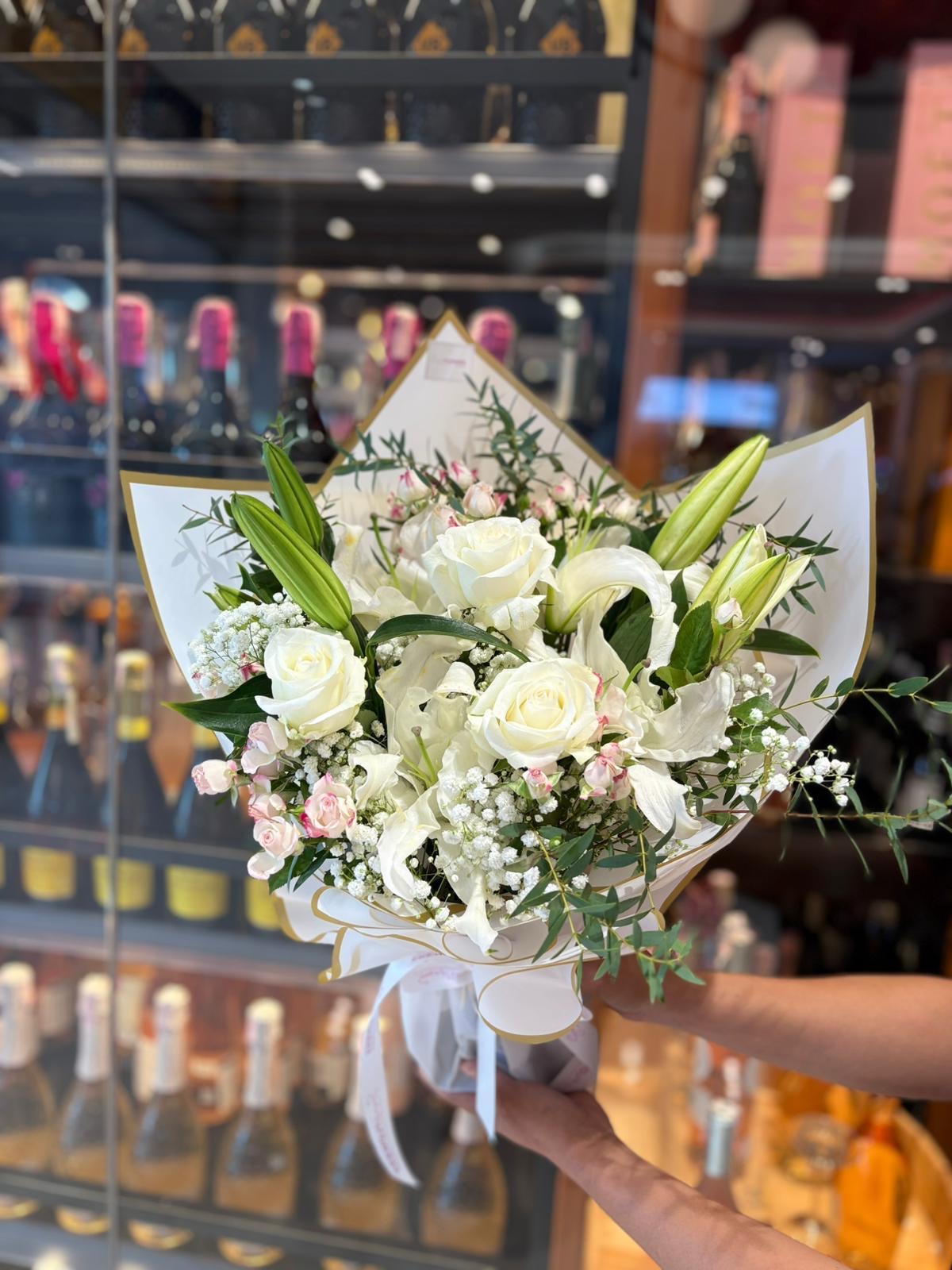 Elevate any occasion with White Elegance. This stunning arrangement features pure white roses, delicate babies breath, and lush greens. Perfect for impressing with its elegant and timeless beauty.