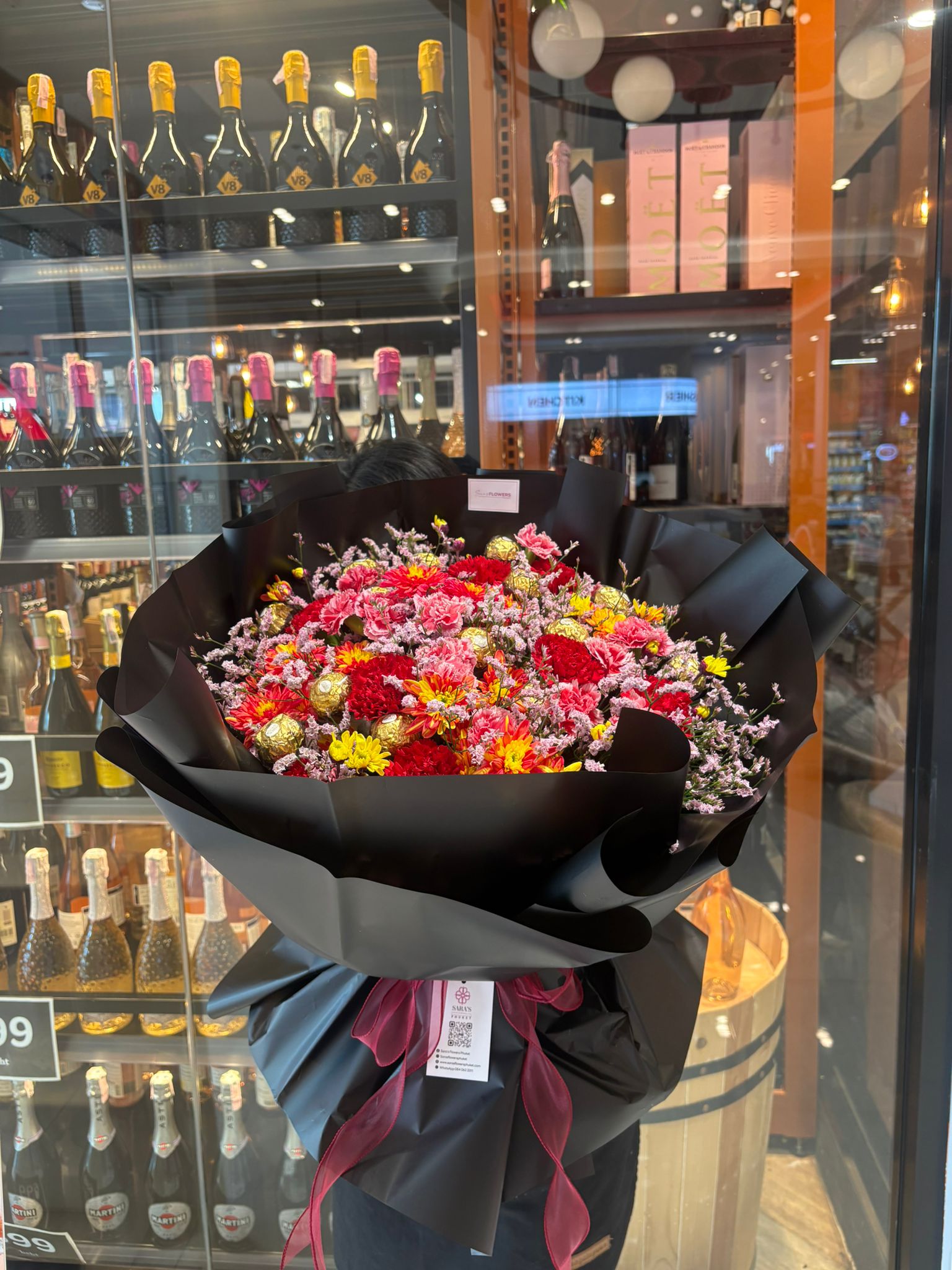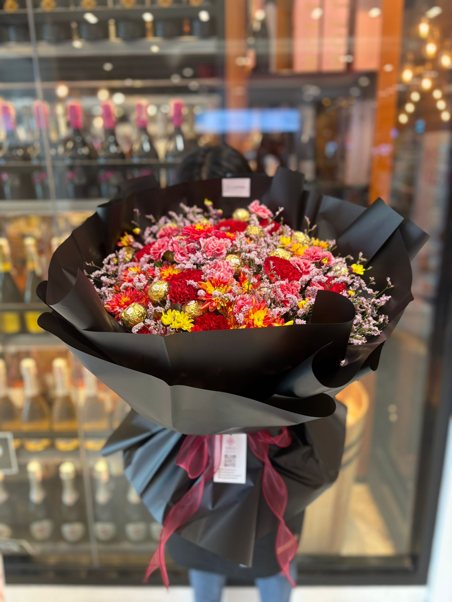 Ignite passion with our Ferrero Flame bouquet! Vibrant red blooms paired with delectable Ferrero Rocher chocolates create a playful yet romantic gift. Watch eyes light up when you surprise someone with this irresistible combo of flowers and chocolate—because why choose between treats when you can have both?