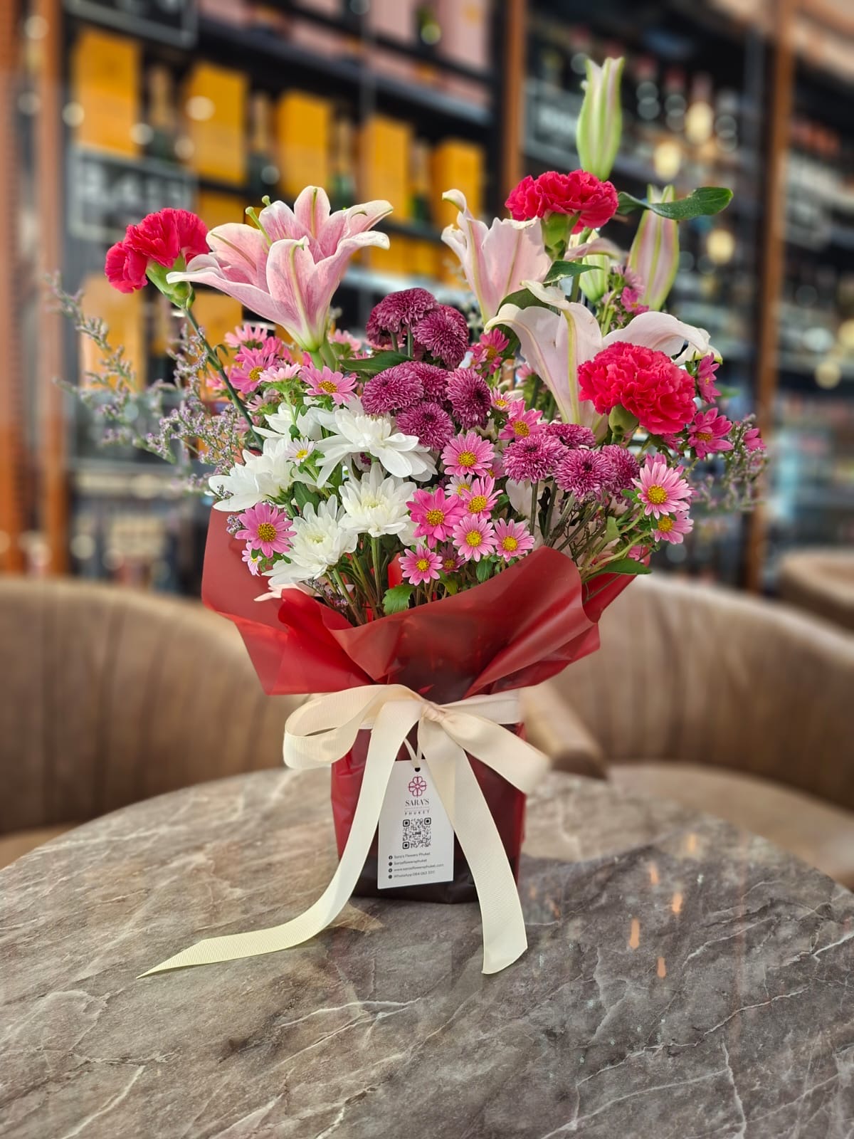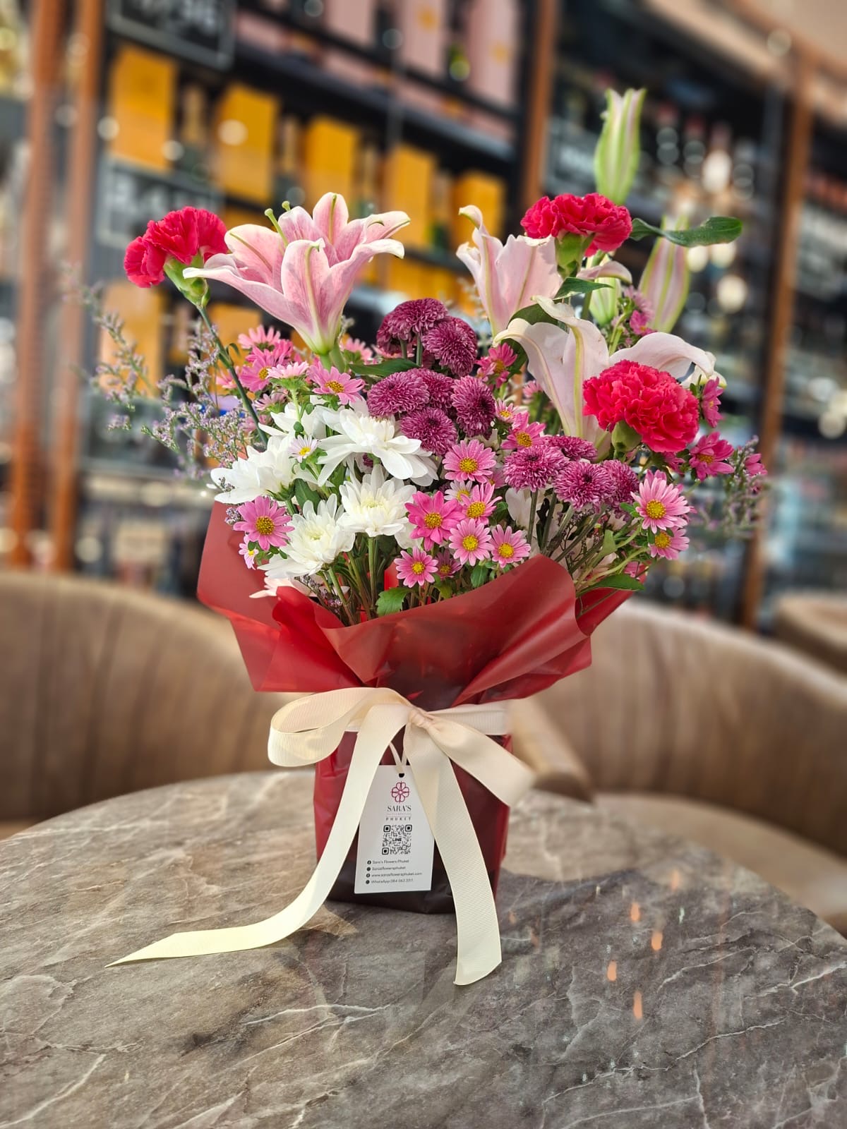 Celebrate vibrant joy with the Pink Fireworks bouquet! This lively arrangement combines elegant pink oriental lilies, bright hot pink carnations, cheerful lavender and magenta button chrysanthemums, and fresh white-green mini mums. Wrapped in deep pink paper with a matching ribbon, it’s a playful burst of color perfect for spreading happiness and admiration.