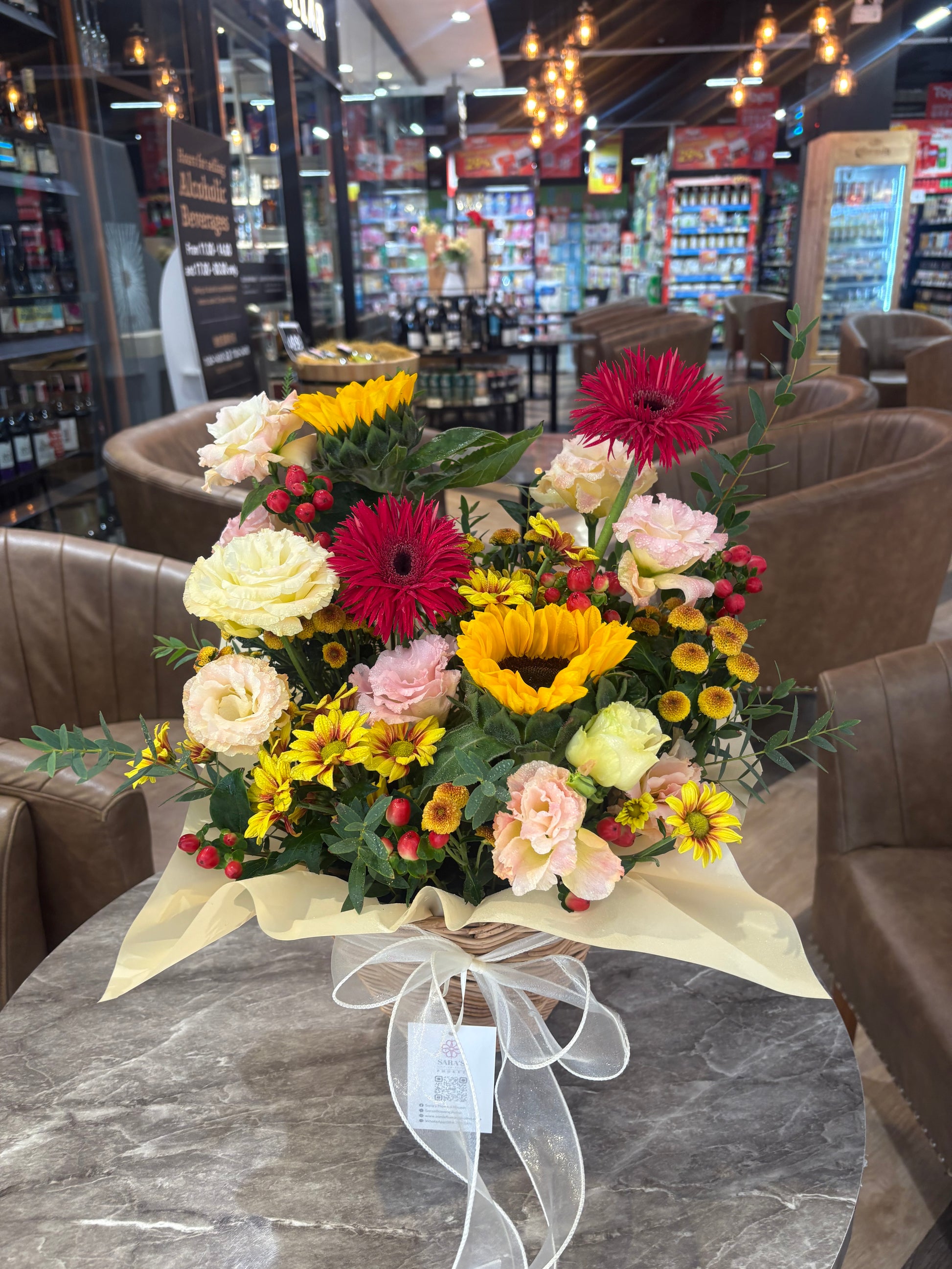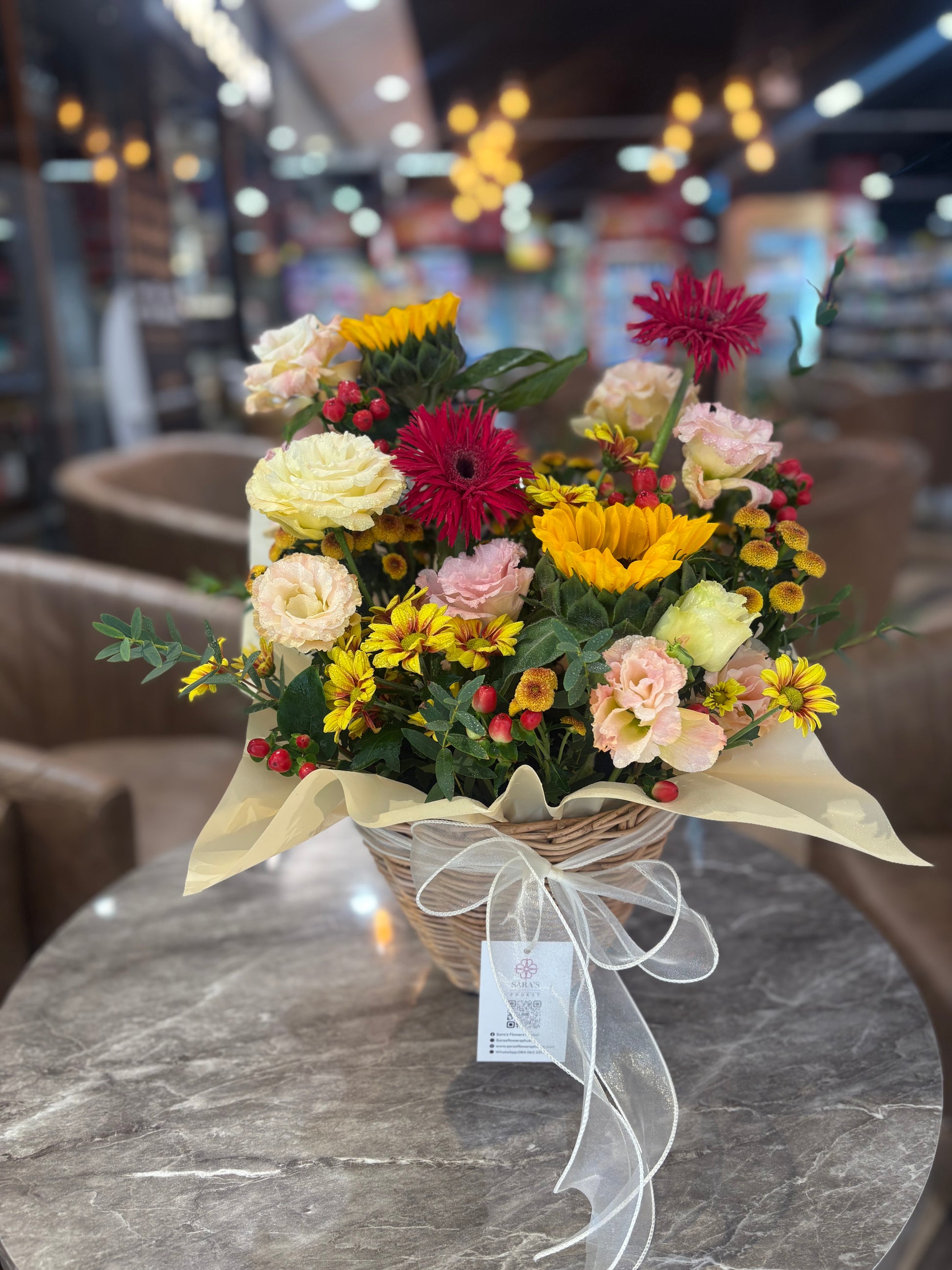 Celebrate the season with Harvest Radiance, a lively basket bursting with sunny sunflowers, creamy yellow carnations, and bold red gloriosa lilies. Festive red hypericum berries add a playful pop, while eucalyptus and lush greenery bring a fresh, natural vibe. All nestled in a charming woven basket tied with a sleek black ribbon, this arrangement is the perfect cheerful gift to brighten any day.