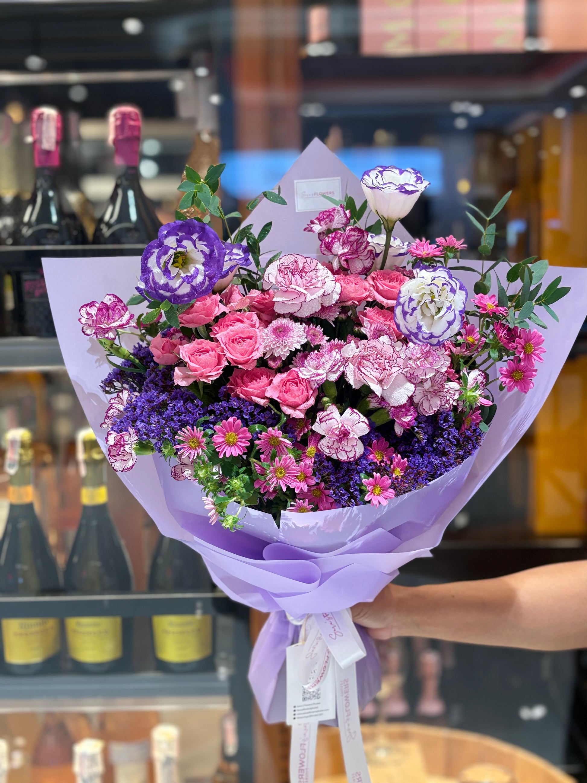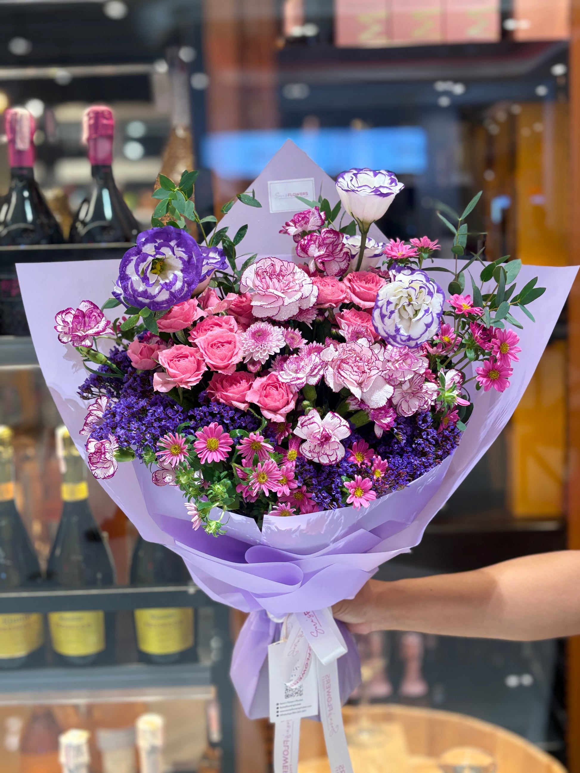 Celebrate the magic of lavender with this playful bouquet bursting with pale pink roses, purple statice, and cheerful magenta daisies. Soft lisianthus and carnations in dreamy shades mingle with lush greenery and elegant floral spikes, creating a whimsical, free-flowing charm. Wrapped in lavender and lilac paper with a ribbon, this bouquet is a joyful symphony of color and romance perfect for brightening any day.