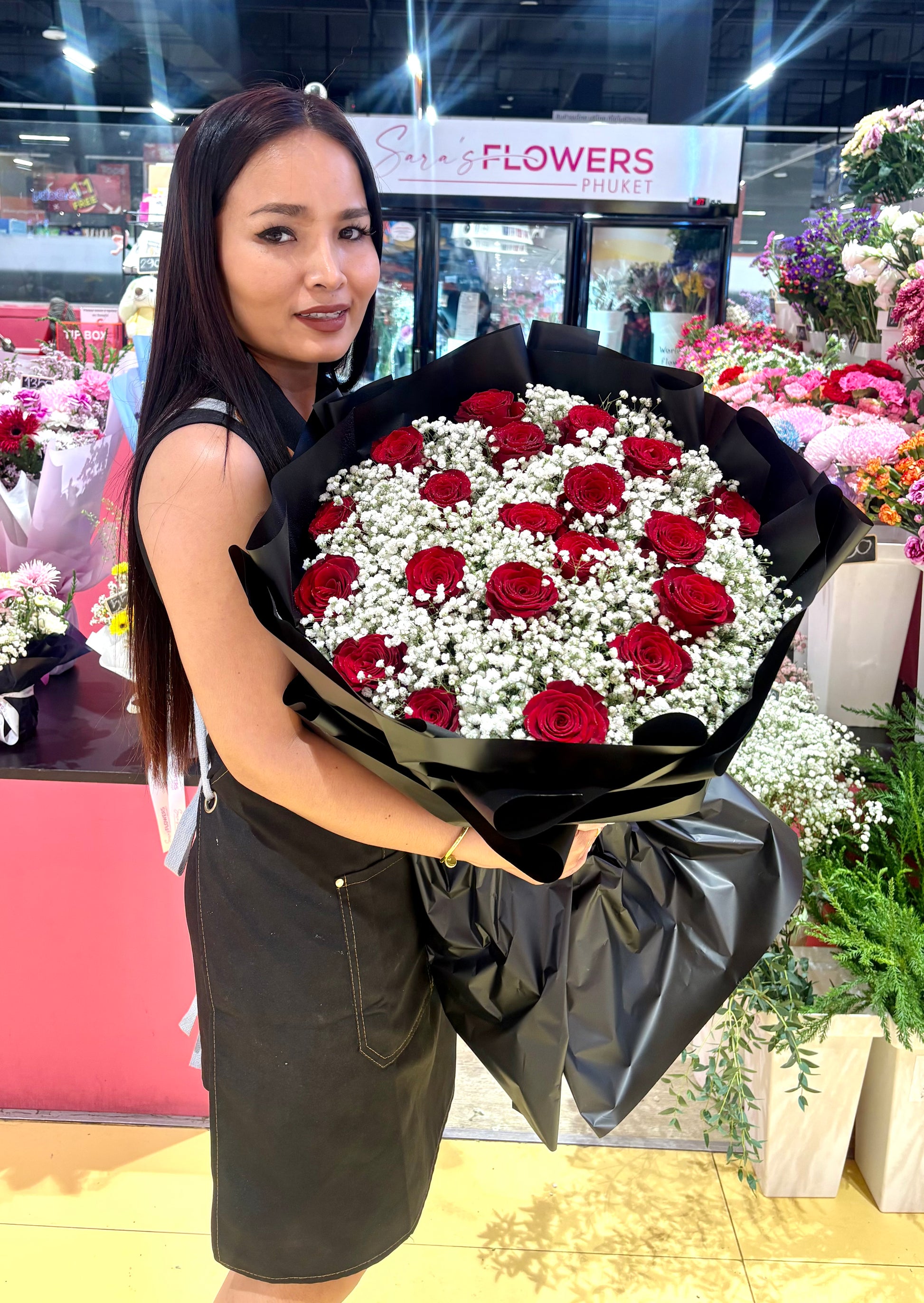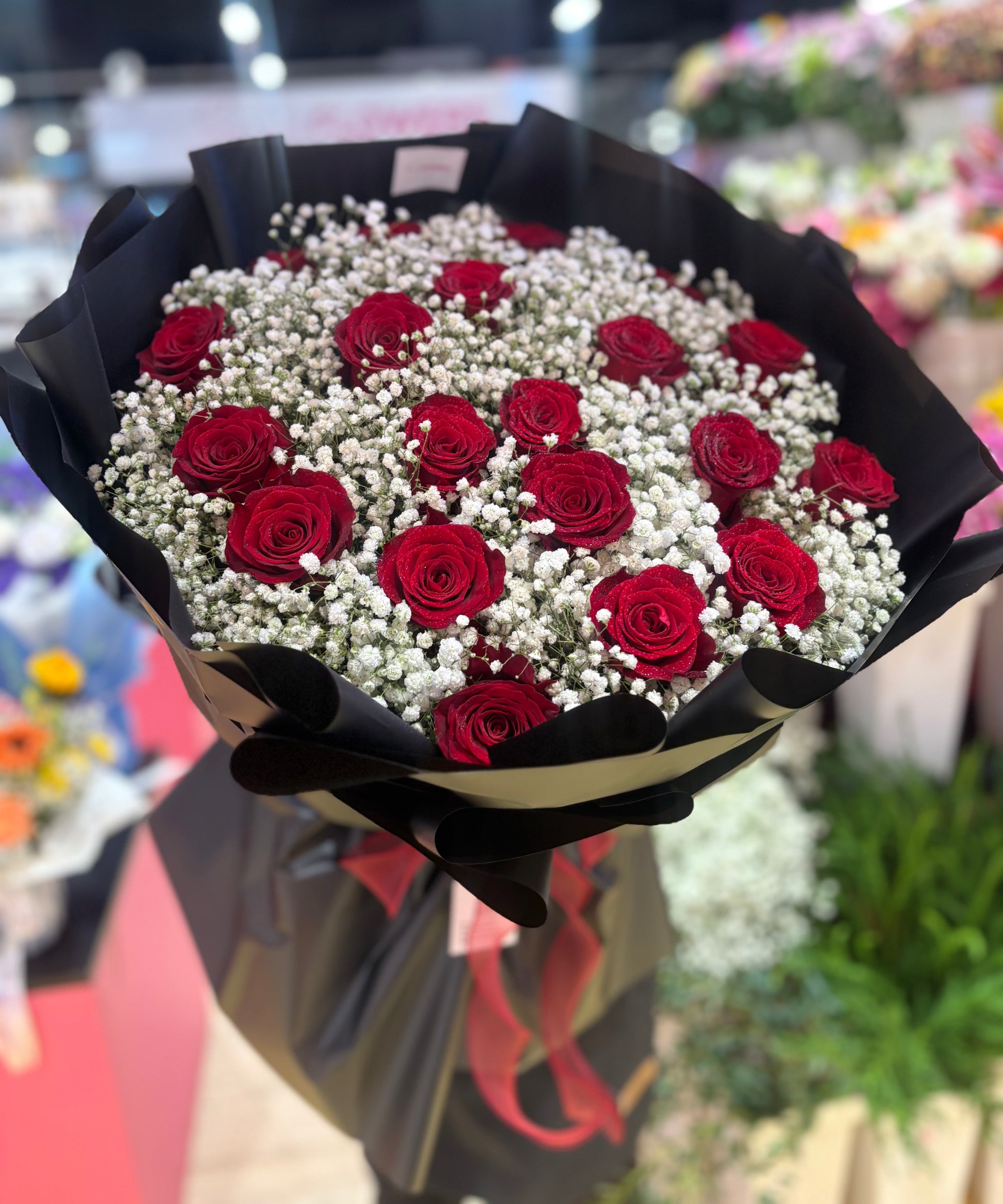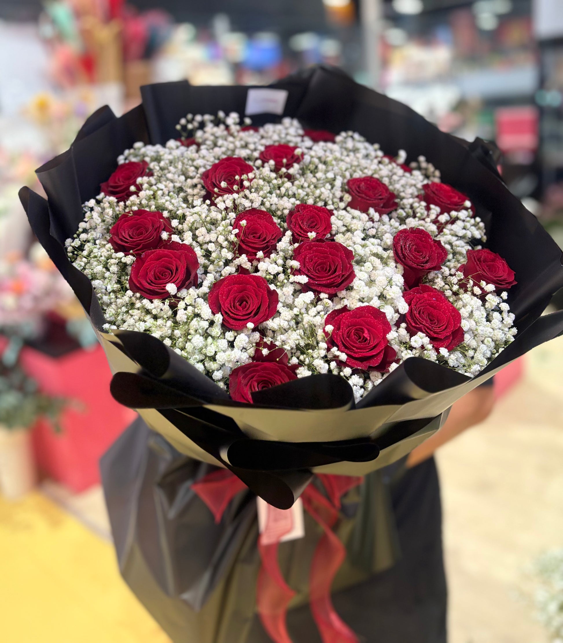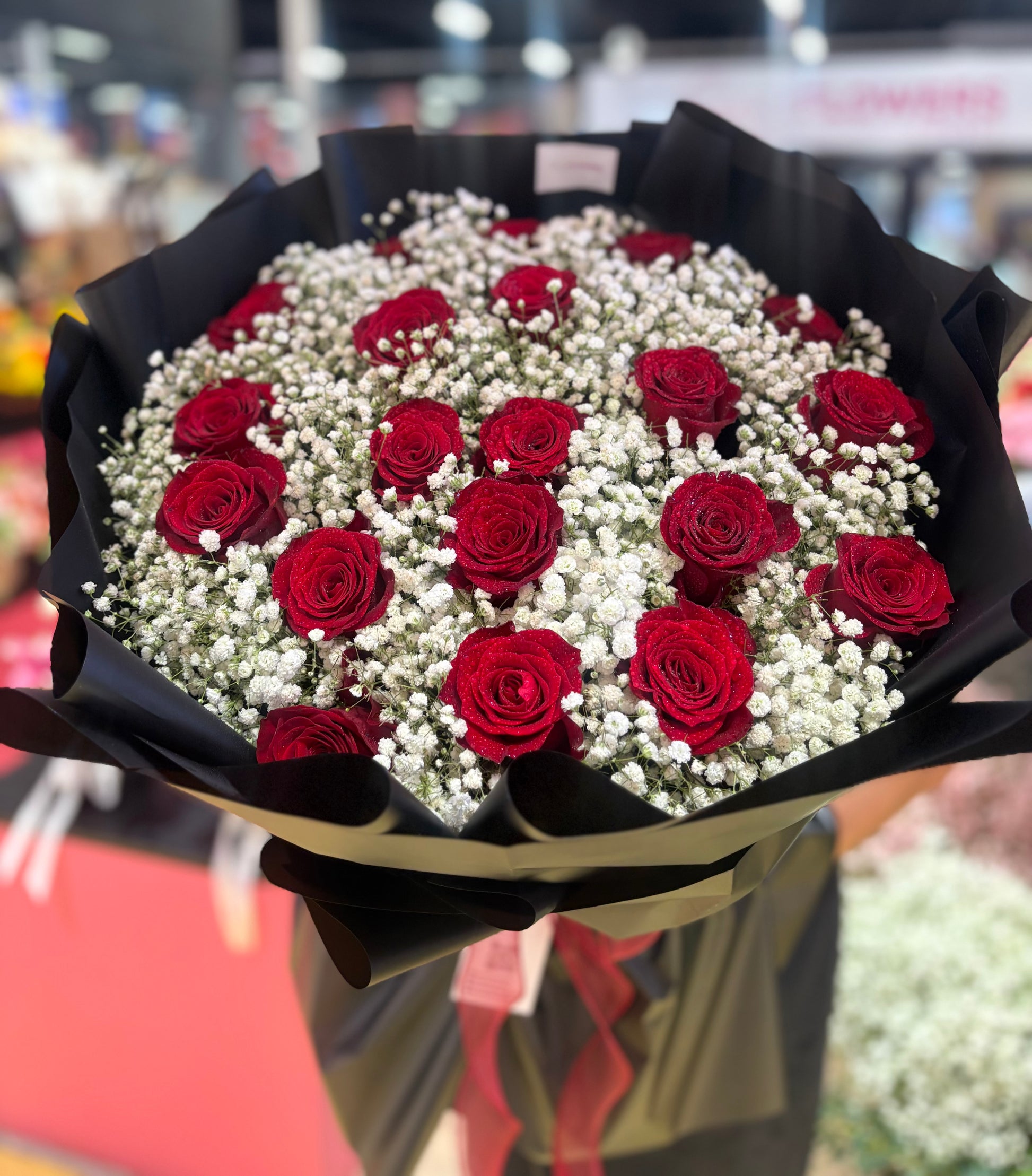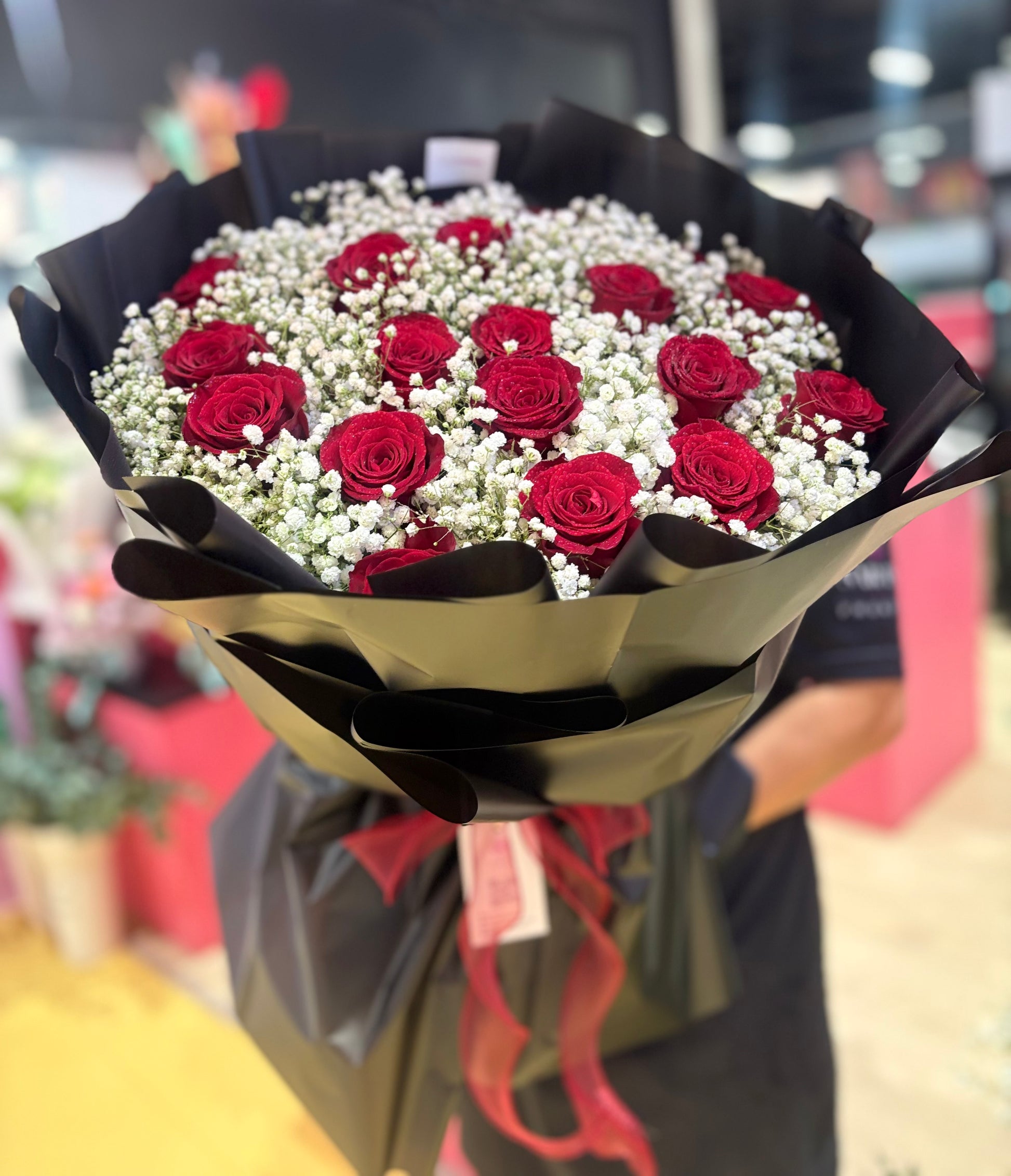 Wrapped in sleek black premium paper and finished with a matching deep red ribbon, this bouquet makes a powerful statement of love, admiration, and sophistication. The larger volume of baby’s breath gives it a luxurious, cloud-like effect—perfect for special occasions when only the grandest gesture will do.