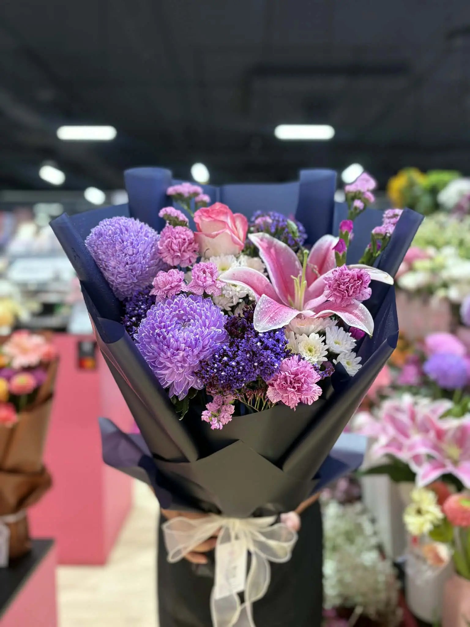 This bouquet combines the beauty of fragrant pink lilies, delicate roses, lush lavender chrysanthemums, charming mini carnations, and deep purple statice. The navy wrapping adds a modern, stylish touch that makes the colours shine. Ideal for romantic surprises, thoughtful gifts, or any moment you want to make truly special.